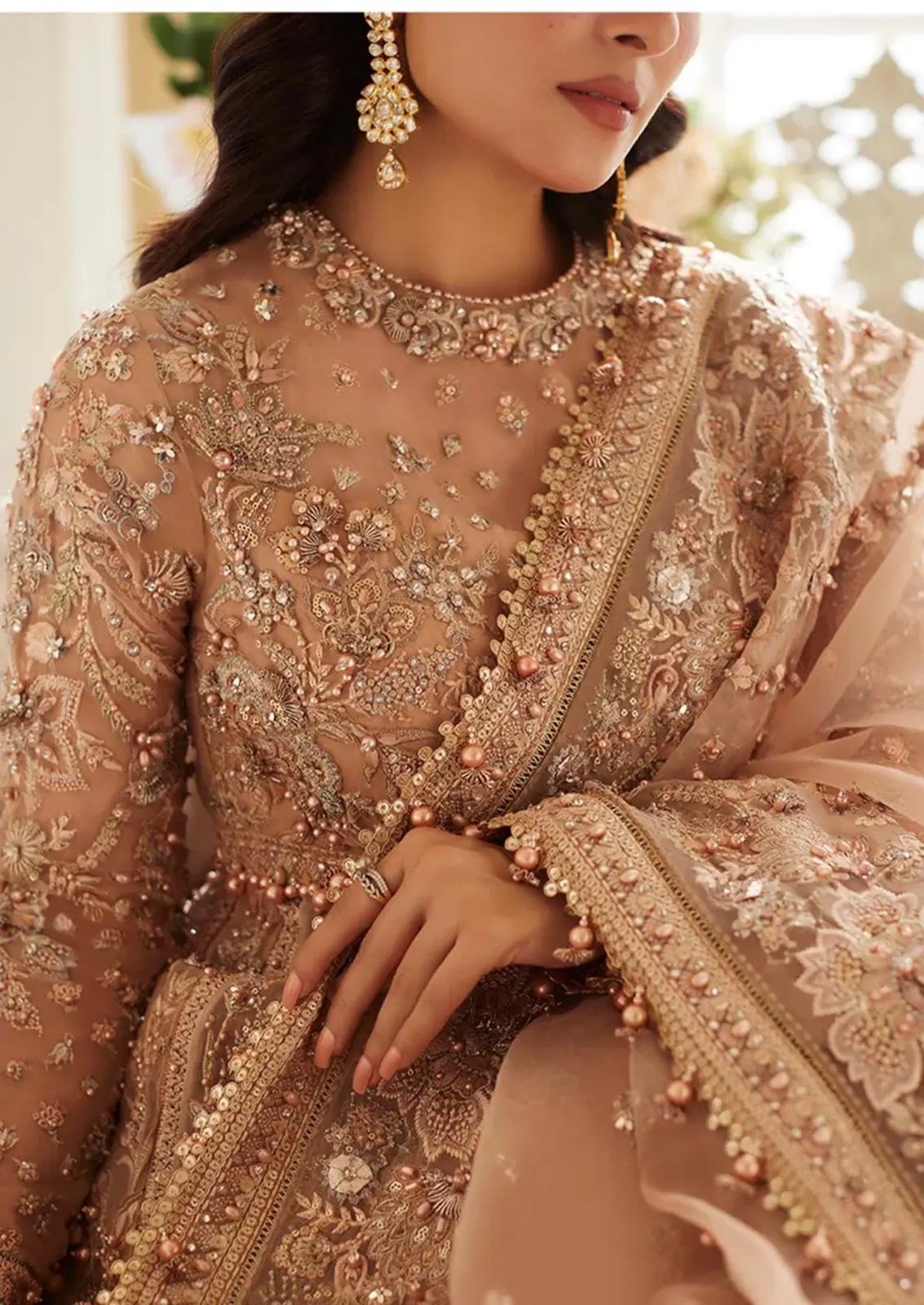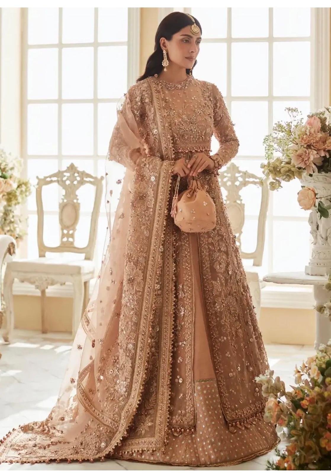 Spectacular nude beige bridal lehenga featuring exquisite heavy embroidery with pearls, sequins, and intricate thread work. This opulent three-piece ensemble includes a richly embellished full-sleeve blouse, a voluminous lehenga skirt with all-over embroidery and pearl detailing, and an elegant embroidered dupatta with pearl-bordered edges.